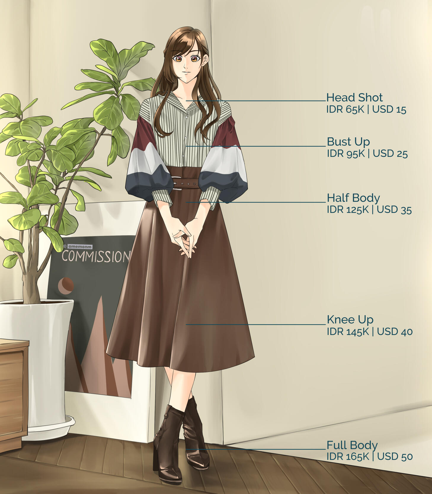 - Complex character design (e.g Genshin Impact characters) will cost starting from IDR 15K | USD 5 each character